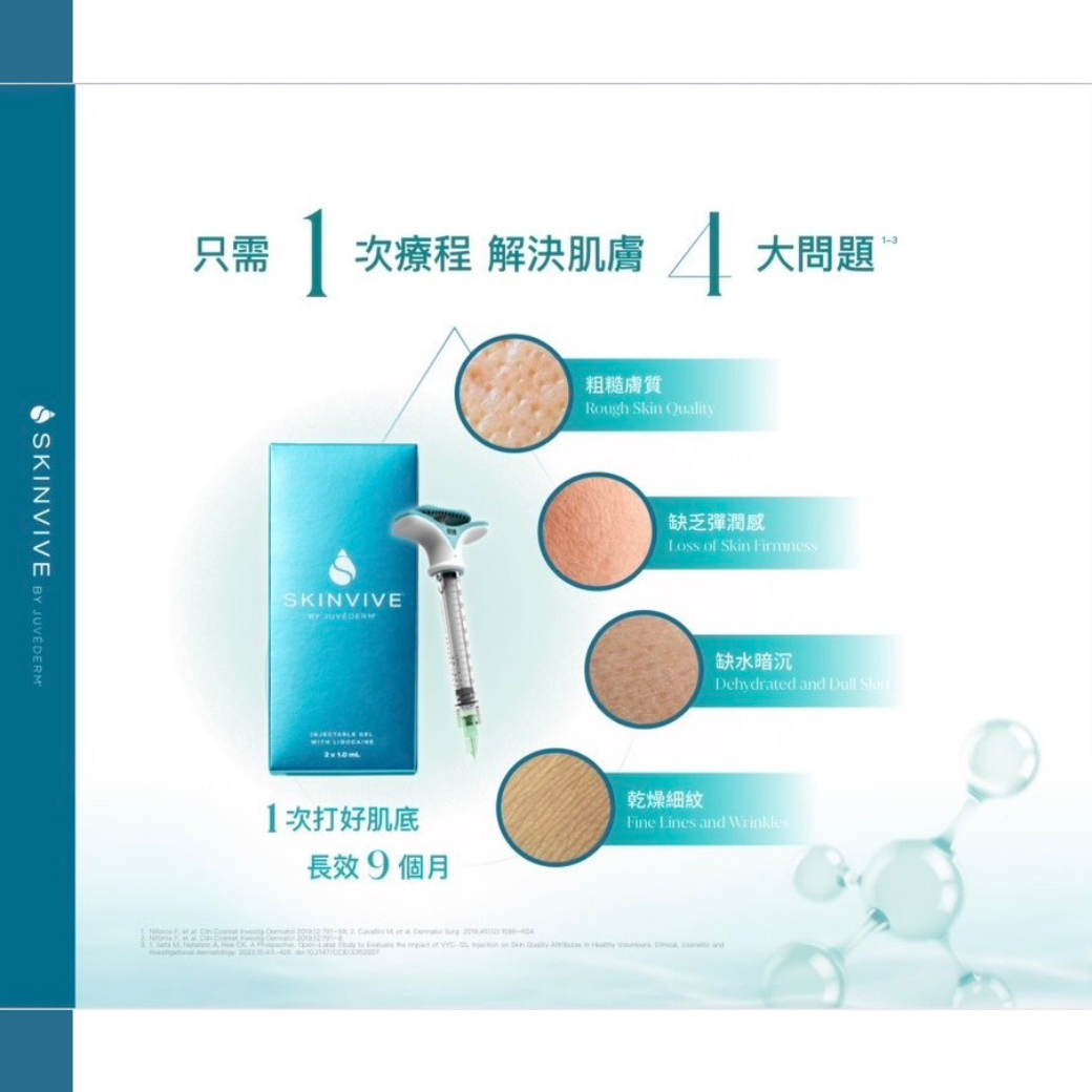 SKINVIVE是一種經特殊設計的玻尿酸注射療程,與傳統填充型玻尿酸不同,它並不是用來「填補凹陷」或「雕塑輪廓」,而是著重於:改善膚質、提升保水度、增加肌膚光澤感。