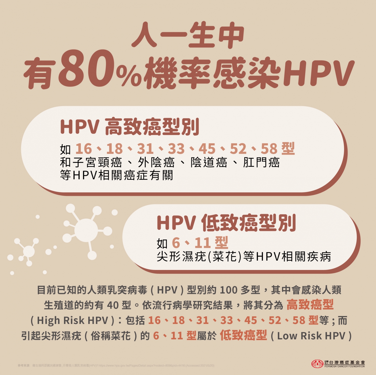 HPV(Human Papillomavirus)是一種透過親密接觸傳染的病毒,目前已知超過100種型別,其中約40種會感染生殖系統 。這些病毒可分為兩大類: