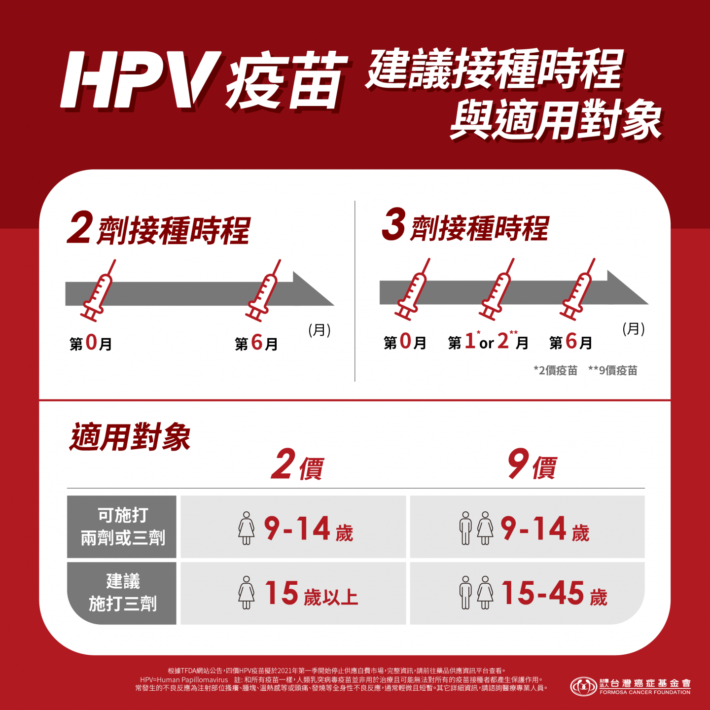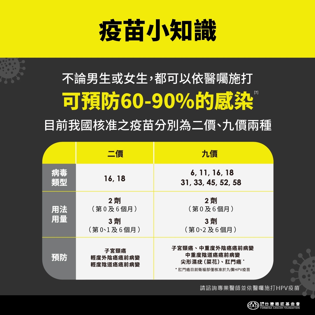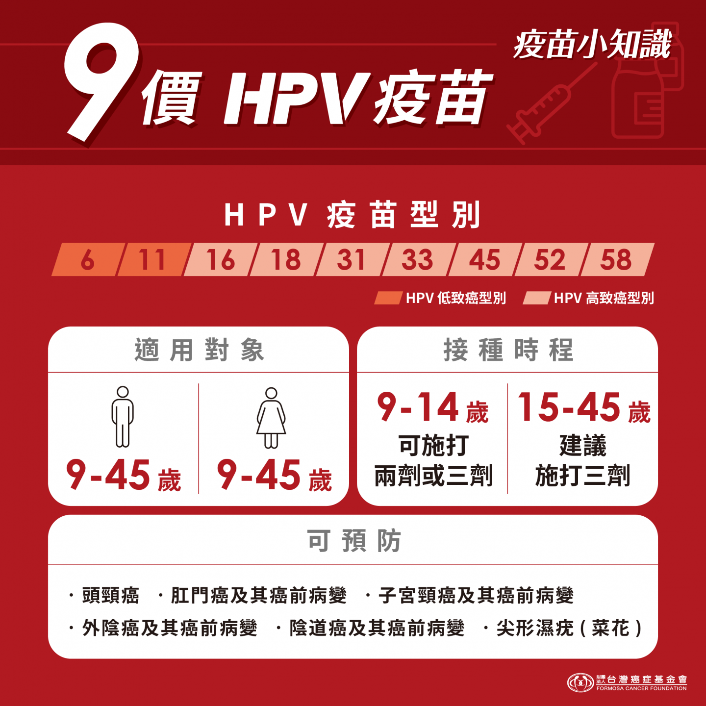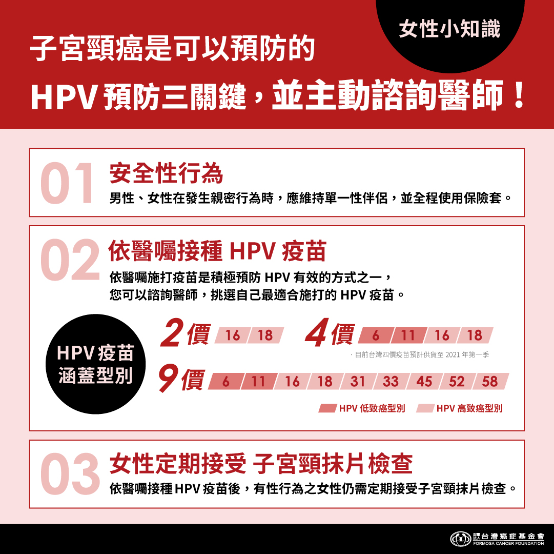 - 預防型別:6、11、16、18、31、33、45、52、58